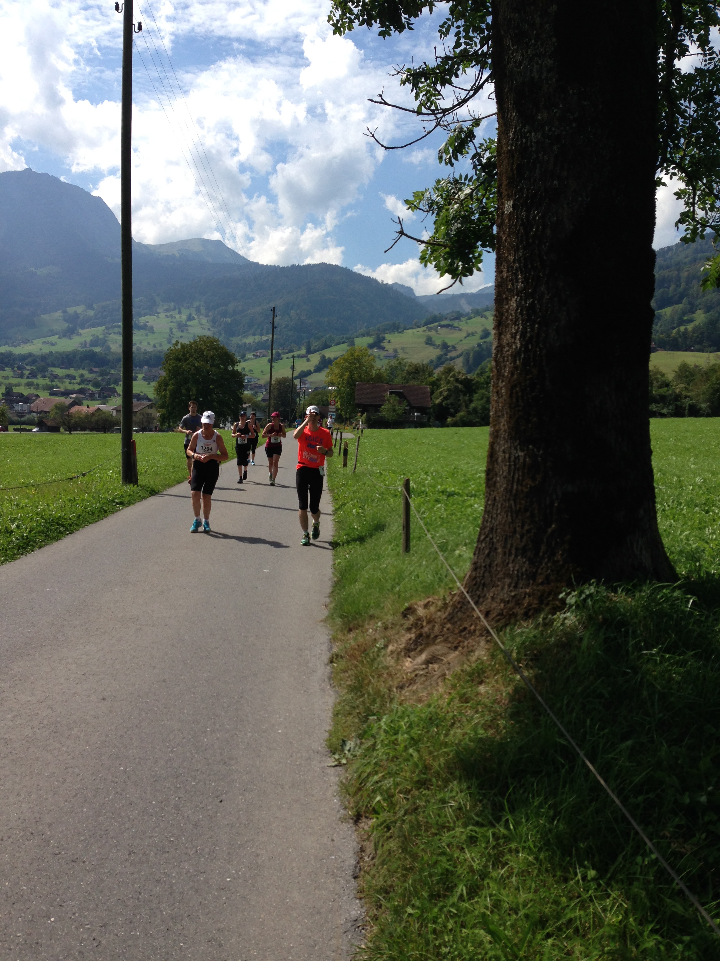 Von Sachseln führte die Strecke weiter nach Giswil, wo nach einem kurzen Bogen (um die 21.1km voll zu bekommen) der Weg zurück nach Sarnen führte. Jedoch am anderen Seeufer entlang. Nun begann der schönere Teil der Strecke, jedenfalls meiner Meinung nach. Es wurde etwas hügeliger, die Strecke führte auch mal durch den Wald und immer wieder hatte man wunderschöne Ausblicke auf den See und die Berge. Und unterwegs gab es immer wieder Musikgruppen zu hören. Ländlermusik, Alphorngruppen, Schulbands, Guggenmusik, für jeden war etwas dabei. Verpflegungsstellen gab es auch genügend, eine sogar mit Isostar Gel, damit man nochmals Energie für den Schlussspurt tanken konnte.