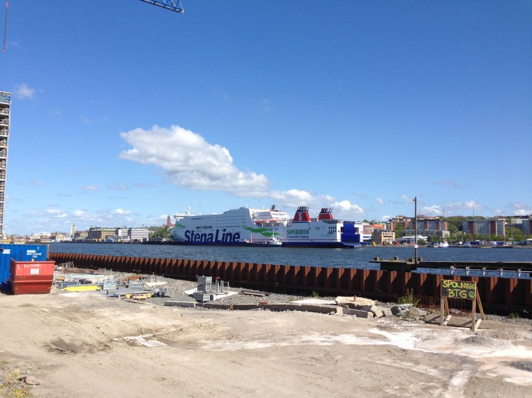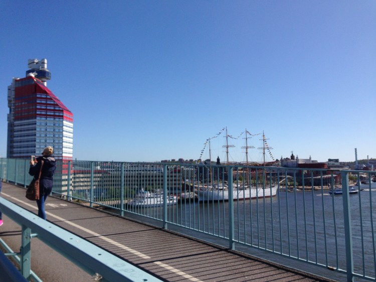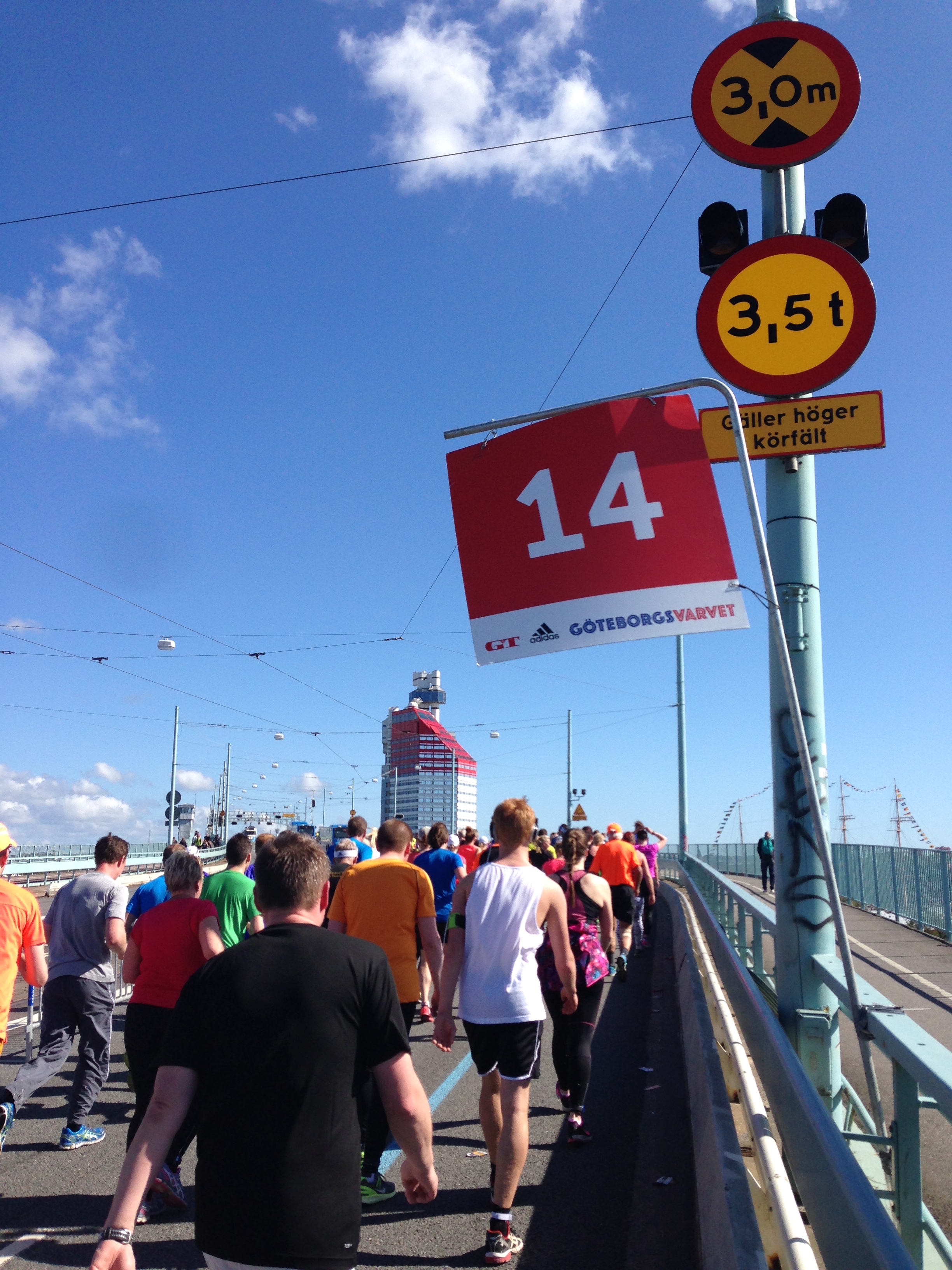 Kurz nach diesem schönen Wohnquartier kam dann auch schon die Steigung hinauf zur Brücke Älvsborgsbron. Ja, genau, diese grosse Brücke. Der Anstieg war zwar anstrengend, aber die Aussicht von der Brücke über Göteborg war beeindruckend. Der Verkehr rollte neben den Läufern über die Brücke und immer wieder fuhren Autos vorbei, die hupten und aus denen „Heja heja-Rufe“ zu hören waren. Nach der Brücke führte die Strecke auf der anderen Seite des Flusses Göta älv nach Eriksberg. Dort hat es viele neue Wohnungen, viele davon in umgenutzten Industriebauten. Architektonisch sehr interessant anzuschauen, wie da aus einem ehemaligen Industriegebiet ein Wohngebiet entsteht. Die Strecke verlief grösstenteils dem Fluss entlang und überall applaudierten Zuschauer, die sich ein schönes Plätzchen am Fluss gesucht hatten, um den Lauf anzuschauen. Es gab unterwegs auch immer wieder Musik für die Läufer, Blasmusik, Rockbands, Schülerorchester, DJs, für Unterhaltung war gesorgt. Und verpflegt wurden wir Läufer auch genügend oft. Es gab ungefähr alle zwei Kilometer Wasser und an jeder zweiten Verpflegungsstelle auch Sportgetränke.